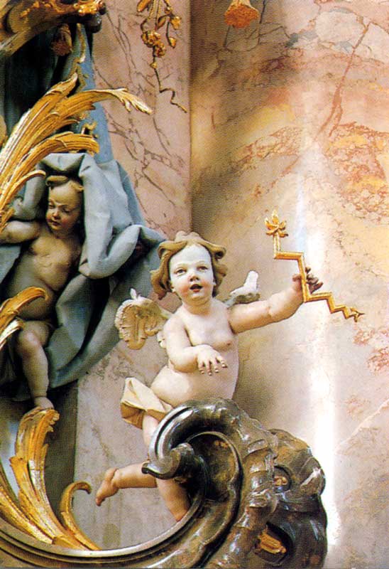 | Quelques manœuvres pour placer notre Aigle à l'abri du soleil, puis nous pénétrons dans l'avant-cour; je suis frappé par la grandeur du bâtiment : la façade, de près de 220 mètres de long, s'articule autour d'une magnifique porte à décor baroque couronnée d'une tour; elle s'achève par la façade de l'église elle-même surmontée de deux clochers élancés. Grande unité de style, baroque, et de couleur, enduit jaune crème avec encadrements blancs. L'ensemble respire la noblesse et la richesse. | ![]() Porte de l'Abbaye de Saint Florian |