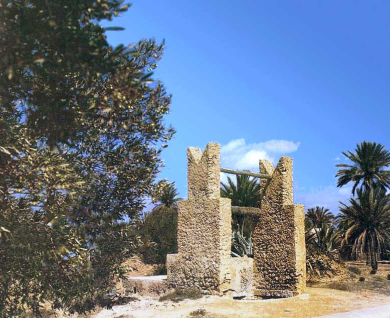 La grande porte de Bab Diwan est en restauration; elle constitue un fond intéressant pour les gros plans sur les pittoresques personnages que j’y filme à la vidéo. Nous continuons jusqu’à l’angle sud-ouest où l’ancienne casbah a été complétement restaurée et transformée en Musée d’Architecture tunisienne très bien présenté. J’y découvre, entre autres techniques millénaires, comment les anciens murs étaient construits de pierres liées par de l’argile friable mais renforcés par des grosses branches (comme le font maintenant les fers dans le béton) et rendus étanches par l’application d’une couche de chaux. Plans et maquettes de maisons, de fermes et d’édifices religieux complètent ce panorama. | ![]() Sfax : la porte Bab Diwan et la médina |