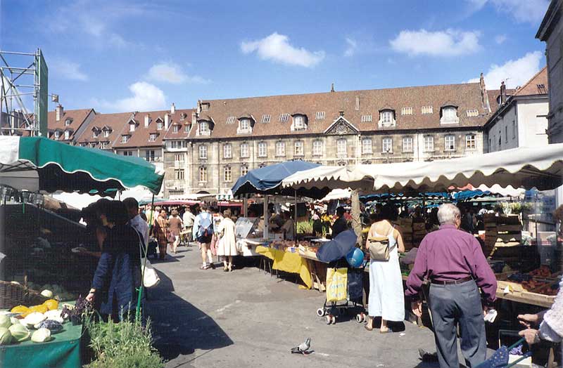 près du vieux Pont Battant où se tient un marché animé et coloré. | ![]() Besançon : marché Place de la Révolution, près du Pont Battant |