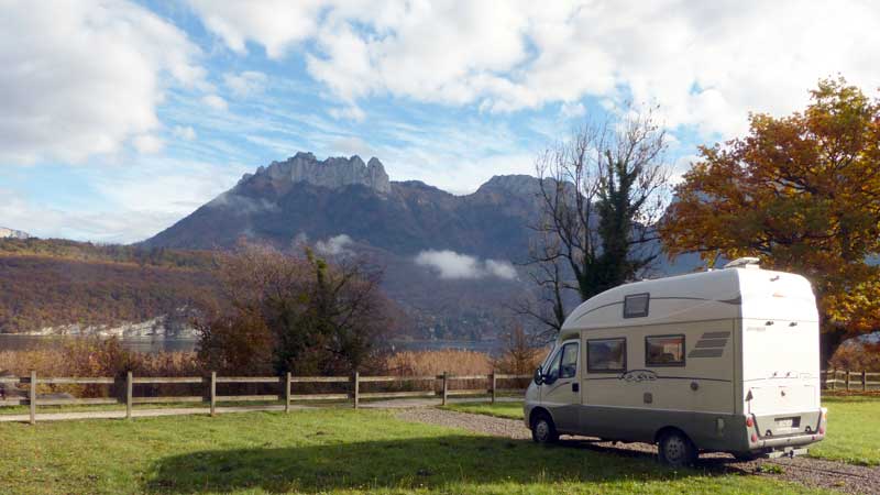 | Pour ce soir je resterai à Evora, mais en testant l’aire de service de la ville indiquée sur le site (liste compilée hier soir) et sur le GPS (fichier Garmin installé en même temps). Effectivement je trouve presque aussitôt le bel aménagement, à environ 3 km en suivant le parcours indiqué sur l’écran. Les quelques stationnements vastes et bien espacés sont à bonne distance de la route, et la borne de service propre et très fonctionnelle. Un seul autre camping-car y a posé son bivouac, je fais de même après avoir refait le plein d'eau et vidé la cassette. | ![]() Bivouac sur l'aire de camping-cars d'Evora au matin |