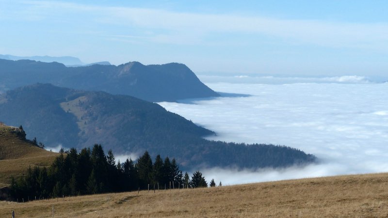 Réveillé à 7:20 par la circulation qui commence à s’amplifier sur la nationale toute proche, je décolle 10 minutes plus tard, remettant à une halte ultérieure douche et déjeuner. Il fait encore nuit, seule une vague lueur commence à éclairer le ciel grisâtre. Depuis la route, une heure plus tard, je vois apparaître le soleil, d’abord lumière jaune diffusant derrière le couvert nuageux gris stratifié. Puis la demi-cercle d’or émerge progressivement derrière un fond de collines, au loin. Hélas cela ne durera pas, puisque très - trop - rapidement son rayonnement sera absorbé par les nuages qui envahiront bientôt toute l’étendue du ciel. |