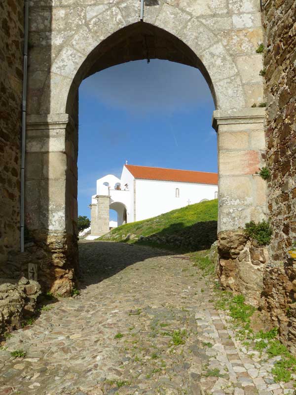 | Laissant l’Exsis sur la place centrale de la ville basse, au pied de la colline, j’enfile la rude montée de la ruelle grimpant à la ville forte qui couronne la butte. Vite essoufflé, je dois modérer mon effort et finis par franchir, sur le mauvais pavé qui s’en va en morceaux, la porte de la muraille. | ![]() Evoramonte : enceinte et porte de la ville haute |