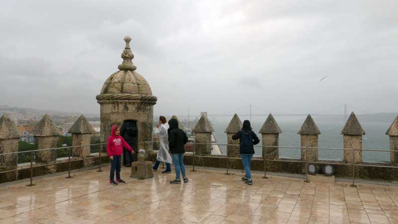 ![]() Belém : avec Hermione sur la terrasse couronnant la tour; au fond, en amont du Tage et dans la brume, le Pont du 25 Avril |