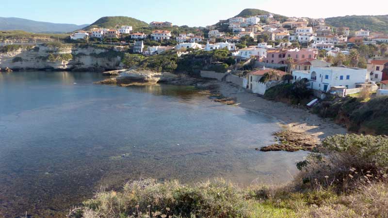 Dans le soir qui tombe (il est déjà près de 17:00) je traverse la langue de terre surmontée par le Capo Frasca et vais bivouaque juste au-dessus de la mer, sur le quai de mise à l’eau d’une des quelques stations balnéaires qui ourlent la côte, à Porto Palma. |