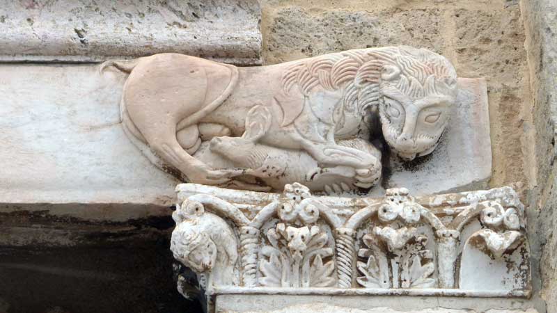 Détour vers la cathédrale, romane à l’origine mais fort remaniée à l’intérieur, et dont l’extérieur est paré des échafaudages des restaurateurs. Son beau clocher de section polyédrique et son bulbe quasi-turque trahissent une certaine influence islamique. |