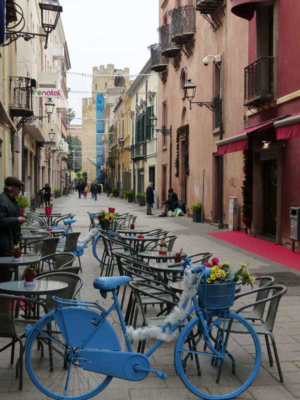 | ... jusqu’à tomber sur la Piazza Eleonora d’Arborea, de forme irrégulière et bordée de grands palais où se trouvent la majorité des édifices publics de style classique : le Municipio, bien sûr et quelques autres, aux façades colorées assez vives. L’hôte du Turismo me fournit les cartes demandées, et une moisson d’autres informations qui m’aideront dans la suite de mon périple vers le sud : il est guide en saison et connaît fort bien la région. | ![]() Piazza Eleonora d'Arborea et Municipio |