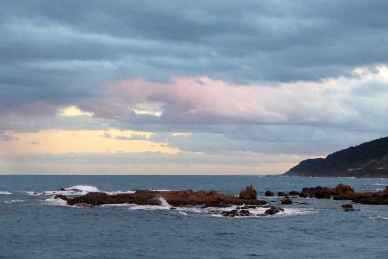 | Le passage de rafales en milieu de nuit, s'ajoutant au bruit des vagues, me réveille un moment, puis je me rendors jusque passé 7:00. Le ciel en partie dégagé m'offre alors un superbe lever de soleil… qui s'éteint bientôt : la journée toute entière sera grise et, qui pis est, pluvieuse. | ![]() Depuis mon bivouac près du port de Solenzara, spectaculaire lever du soleil |