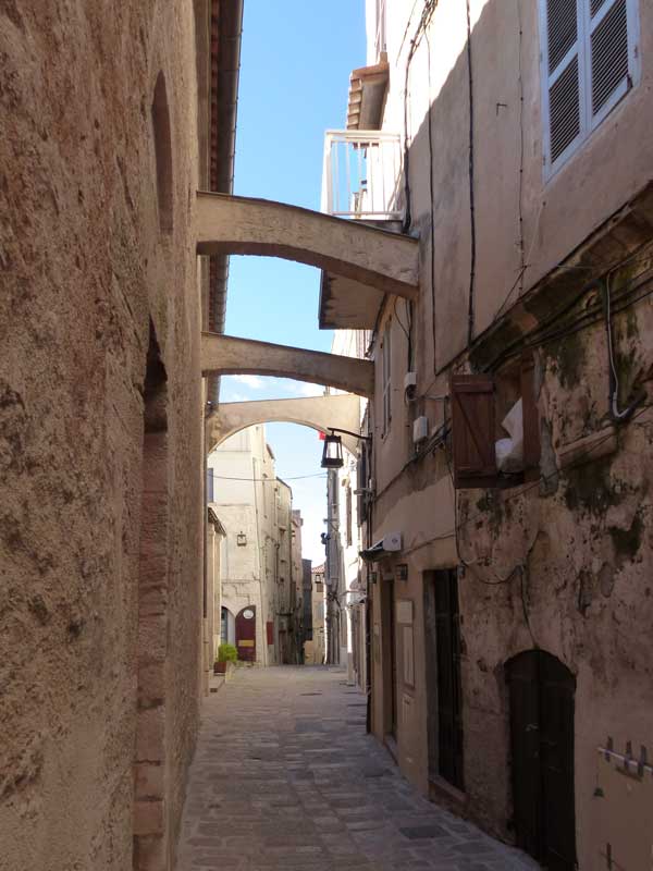 Suivant vaguement l'itinéraire proposé par le G.V. je sillonne les quelques rues étroites et quasi en damier qui constituent la ville-forte de Bonifacio à l'intérieur de ses remparts. Certes le commerce a pu apporter une certaine aisance aux capitaines et aux quelques armateurs qui se livraient au cabotage pour exporter les productions - essentiellement agricoles - de l'île vers Gênes et les autres marché italiens et espagnols. Il n'en parait pas grand chose au plan architectural qui reste globalement très ordinaire. Même les églises comme Ste-Marie-Majeure montrent peu d'originalité, elles ont été trop remaniées, partiellement et incomplètement restaurées… |