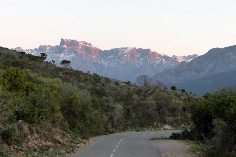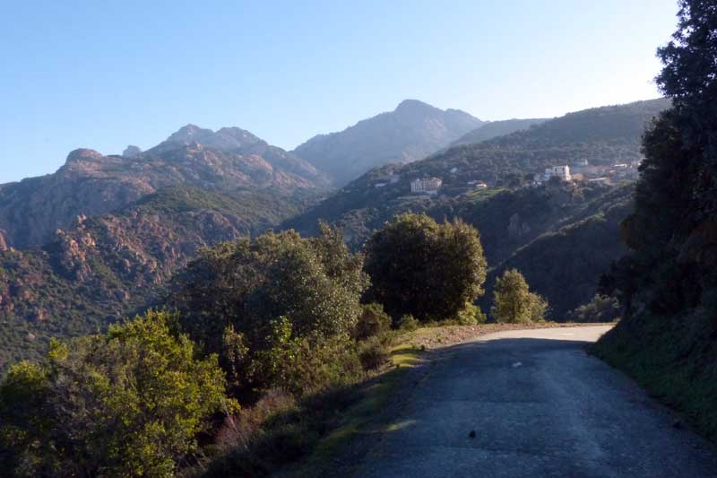 Je mange un morceau sur un belvédère ensoleillé en dessous du village, puis poursuis ma descente encore sportive et très spectaculaire de la vallée du Porto. Ce sont les gorges de Spelunca, dont la route suit le tracé à flanc de montagne, sinuant sans cesse, en offrant une autre fois des vues grandioses et vertigineuses sur les parois presque verticales aux nuances rosées. |