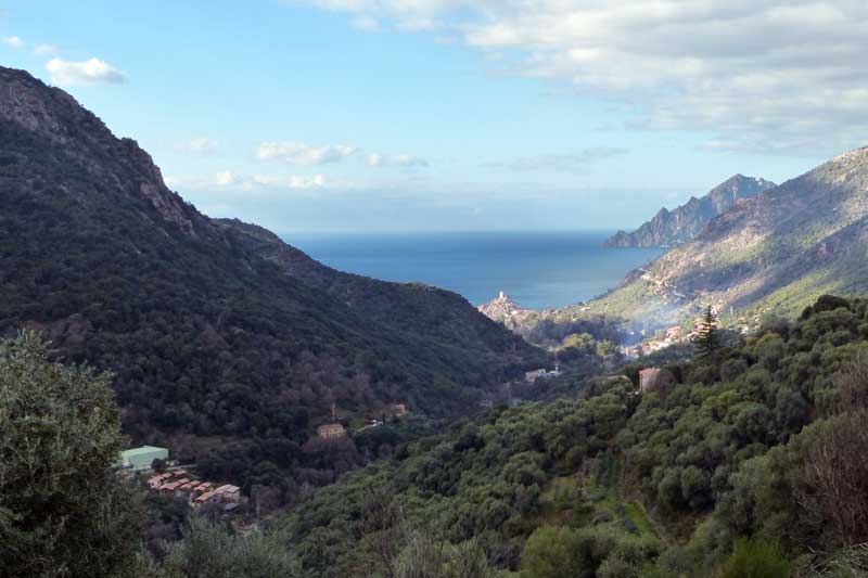 | Belle occasion pour des photos spectaculaires, surtout sur les Calanche voisines et sur le village, mais aussi sur la toute petite plage que je trouve tout en bas, après 500 m de sentier pédestre. | ![]() Piana depuis la route de la plage de Ficaghjola |