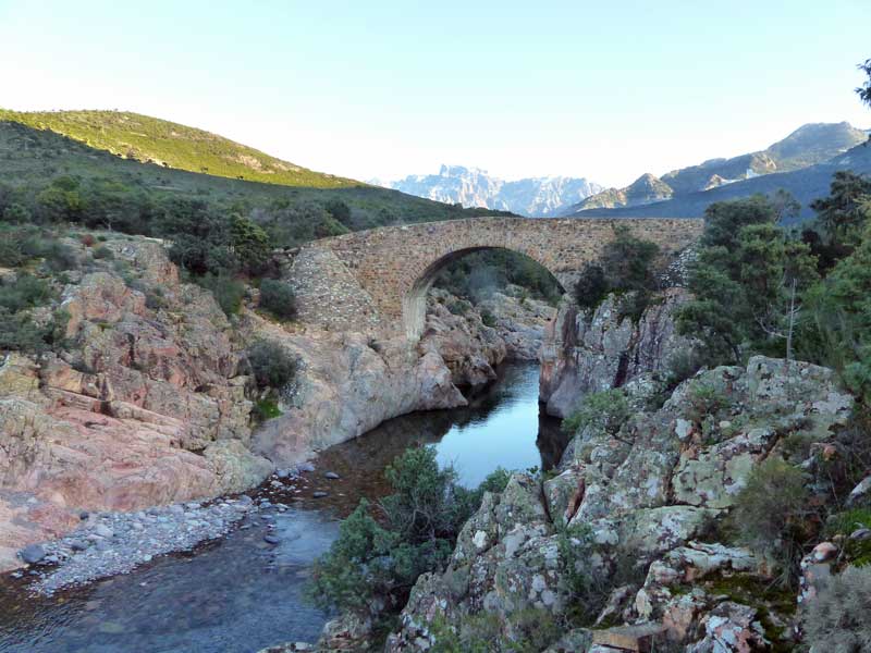 | Nuit tranquille et bon repos jusqu'à mon lever passé 8:00. Il a fait froid cette nuit, tant par un abaissement général de la température annoncé sur toute la France qu'à cause de l'altitude. Mais le ciel est toujours aussi clair et dégagé, ce qui me vaudra un fort beau parcours à rebours de la Scala di Santa Regina. En quittant Castirla, coup d’œil au trois arches du beau pont qui enjambe le cours torrentueux du Golo. | ![]() Le pont de Ponte-Castirla |