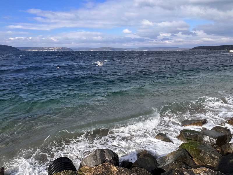 Rendu dans la petite ville je tente de gagner la pointe la plus avancée vers l’Europe, mais me heurte à une barrière militaire : terrain réservé à l’armée, on ne passe pas, photos interdites, etc. Je me rabats sur le quai menant au départ du ferry où je prépare mon déjeuner que je déguste devant le spectacle du détroit animé par les grosses vagues que lèvent les rafales du vent tendant à forcir… En face on aperçoit très bien les murailles aux teintes rosées du fort de Kilitbahir qui gardait le passage du côté européen. |