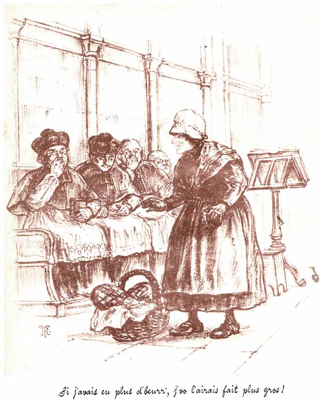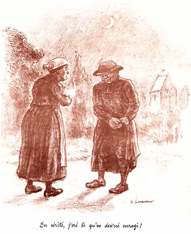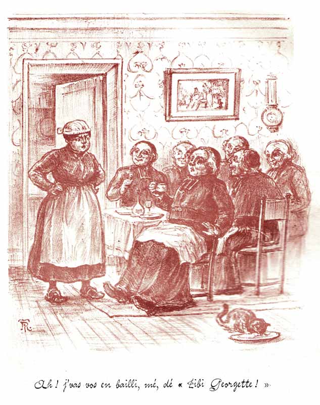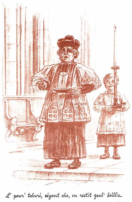el' fromage et la pouère, A c't' heu qu' j'avons fini d' daînner, Faut que j'vo conte eun' bouenne histouère, Por vos' aindi à digérer. O s' passit dans man vieux Saint-Georges, Où que j' sus nê et mal bâti, Et iou qu' no veit d' si biaux camps d'orges, Faire onduler leux blonds épis. Faut dir' qu'aut'fais, dans not' paroueisse, No n'tait pas impies comme à c't' heu, Et nos allait périer l' bon Dieu, Tous lé dinmanch's, à la grand' messe. Es grand's fêtes d' l'année, y'avait du pain bénit, D' la belle galette dorée, En pât' bi'n amendée, Qu' lé gens rich's, tour à tour, s'empressaient à fouerni. Parmi ces personn's bifaisantes, Y'avait la bouenn' maitress' Dubos, Eun' femm' co bi'n appétissante, Surtout por ceux qui n'ainm'nt pas ls 'os ; Comm' c'est quand no prend d' l'âge, olle était bi dodue, Mais san plus triste inconvénient, C'est qu'à la sieut' d'un accident, La paur' malheureus' femme était restée jodue ; Olle était souerde comme. un pot,¬ Et n'importe c'que no l’i dise, Qu' cha sé compliment ou sottise, O n'en entendait pas un mot. C'est cha qui fut la caus' du fait que j' vo raconte, Et c'te paur' mèr' Dubos, depus, en eut bi honte. Cha s' trouvait dont san tour d'offrir l'pain bénit De qui qu'oll' 'tait bi'n ambitieuse. Mais v'là t'y pas qu' la malheureuse S' trouvit à court de beurr', quand o s' mint à l’ pêtri. Tout'fouais, comme y fallait qu'o s'hâte, Et qu'o t'nait à la qualité, Olle y mint un p'tit brin moins d' pâte Afin qu' y sé bi'n amendé. Justement cha s' trouvait por la fêt' patronale, Et conim' c'était l'usag', l' t'churé, por çu grand jour Avait comme invités quiqu's t'churés d'alentour; I's étaient là, dans l' chœur, chacun dans une stalle, Et dame. y s' minr'nt tous à guetti Quand c'est qu' la bouenn' femme arrivit. D'avec san pain bénit couvert d'eun' blanch' serviette, San panier à san bras, et d'un pas majestueux, O fut jusque dans l' chœur devant tous cé moussieus, Qu'écarquillaient les yeux por vée la bell' galette. Or, dans l'effort qu'o fit por mettr' san pani bas, O lâchit un gros pet, mais o n' l'entendit pas, Et cair'yant qu'y trouvaient l' pain bénit trop modeste, Car y s' pinchaient tous l' nez, cairgnant qu' cha n' les empeste. « - Ah! dame ! excusez-en, qu' dit la maitress' Dubos, « Si j'avais eu plus d' beurr', j' vo l'airais fait plus gros ! » |
