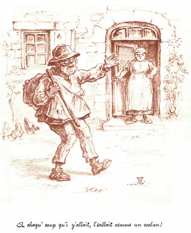 dans man jeun' temps, la ferme d' la Quesnée, Qu'était p't'êt' la meilleur' que n'y' eût dans not' contrée, Rapport à ses herbag's et à san crû itou, Etait sûr'ment bi t'nue par Maîtr’ Françouais Rétout. Faut dir' qu'y connaissait s'n affaire, Su la culture, il 'tait malin; Aussin, sa ferme était prospère, En t'chu li, no n' manquait de rien. No nourrit bi lé gens, par t'chu nous, dans l' Bocage, Et n'y' a d' bon bèr' dans lé tonniâs, Surtout l' sien qu' no fait po l' mès d'ât, Car c'est d' qué qui rend l' mond' bi t'cheuru à l'ouvrage. T'chu maîtr' Rétout, no boulangeait Et no t'cheusait l' pain qu'y fallait; La boulang'rie Etait bâtie Au coin d'un plant d' pommiers, par derrièr' la maison; Et d' temps en temps, l'valet d' ménage, De qui, qu' dans lé ferm's, c'est l'ouvrage Boulangeait eun' vingtain' de bons 'gros pains d' cuisson. Or, v'là qu'un biau matin, allant qu'ri sa fouernée, Gustin, l' valet d' ménag', restit tout éjugi ; Sû lé vingt touertes d' pain, y'en avait deux d' volées, Y fut l' dire à san maître, aussi surprins 'comm' li. Quand l's autr's valets connur'nt l'affaire, Y's en fur'nt tous bi contrariés, Car, dans tout cha, nos a biau faire, No peut quiqu'fais rêt' soupçonné. La chose était presqu' ombéliée, Quand v'là qu' dans lé six mouais apreux, Parmi lé pains d'eune autr' fouernée, Nos en avait co volé deux; D' çu coup-là, pensé bi qu' cha mint tout l' monde en rage, Et l' sien, parmi tout cha, qui faisait l' plus d' tapage C'était un dé valets, qu'nos app'lait l'Enragi, A caus' qu'il avait mauvais' tête. « - Oui, qu'i leux dit, vos êt's tout's bêtes, « Si no veut m' laissi faire, j' veux bi vo gagi « Que j' happ'rai not' voleux ; l'affaire est bi'n aisie : « No m'enfermera l'sé, en d'dans d' la boulang'rie « Et quand l' voleux viendra, « J' saut'rai d'ssus comme un cat. » « - Eh ! bi, qu' dit maîtr' Rétout, quand no r'f'ra eun' fouernée, « Pus qu' l'Enragi est si malin, « Qu' no happ' donc l’ voleur de pain, « Mais dam', tant pis por li s'il a la goul' cassée. » Quand tout fut bi conv'nu, fallait vei l'Enragi Fair' dé grands embarras d' vant les autr's domestiques, Nos airait cru, à l' veie, qu'il allait tout mangi, Et y n' causait qu' du voleux, qu' tuerait à coups de trique. Fûtés d'entendr' çu bagout-là, Lé s’ autr's valets qui n'taient pas bêtes Dans l' mêm' bounet s' minr' nt tous la tête Afin d' l'i jouer l' bon tour que v’ là : Quand l' pain fut défouerné, dans l' coin d' la boulang'rie, Y's eur'nt soin d'apporter un p'tit lit d'écurîe ; C'est d' qué qu'est fait à bi peu d' frais, Eun' paillass' dans eun' caisse en bouais, A peu' près' d' la longueur d'un homme ; Portant y' en a qu'y font d' bons sommes, L'Enragi tout l' permi, Quand il 'tait fatigui. Avant que d' l'enfermer, l's aut's valets, sé confrères, Po l' sout'ni dans s'n expédition Y' apportir' nt êun' boueinn' collation, Et por bi l'arroser, eun’ douézain' d’ pots d' bère : Y savaient bin qu'à l'occasion, Notre homme était gouermand d' béchon : Quand c'est qu'o l' mint au mond', sa mère, à défaut d' rentes, L' y' avait terjous bailli un gosi bi'n en pente. « - Allons! qu' dit l' grand valet, beis un coup, l'Enragi, «Cha va t' bailli dé forc's, faut t'acouter, m'n ami. » C'était du vrai fout-bas, du bon beire à plein' goule. No mordait dans la pomm' tant qu'il 'tait parfeumé, D'avec cha, pétillant, un brin amerteumé; D' qué qui fait, comm' no dit, tant d' bi par où qu' cha coule. Por happer san voleux, L'Enragi but comm' deux ; Aussi, la collation finie, Y s'en sentait déjà un brin Et véyait dans la boulang'rie Touerniqui tout's lé touertes d' pain; Par là-d'ssus, quand il eut avalé deux grands verres D'un flip carabiné, Où qu' nos avait cauffé, Dans p't'êt' deux pots d' pur jus, eun' chopein' d'iau-d'-vie d' beire, Çu' paur' vieux gas S' trouvit si lâs, Qu'à deux y l' minr'nt 'dans l' lit, quasi sans connaissance, Où qu'i s' mint à ronfler, sans souci d' l'assistance. « - Cha y'est,,,qu' dir'nt lé valets, le v'là bi'n endormi, « A c't'heu' no peut l'enl'ver, y n' va pas s' réveilli ». Là d'ssus, l's uns par devant et les autres par derrière, Y s'emportirent l' lit, comm' no porte eun' chivière. Et sous lé gros pommiers, au mitan du p'tit camp, Y posir'nt gentiment not' gas terjous ronflant. Pendant quatre heur's au moins, y cuvit sa saôlée, Mais la fraîche d' la nieut finit pa l' réveilli. « Nos a-t-y volé l' pain », fut sa premièr' pensée, Et not' saôlard sautit bi vite en bas du lit. Quand y n' vit plus la boulang'rie, Dans qui qu'i s' cayriait enfermé, Il en restit la goul' baîllie Et s' mint à brair' comme un toré : « - Ah! sacré non d' la vie, « Qui qu' và dir' maîtr' Rétout ? « La fouernée est partie, « La boulang'rie itou ! » |