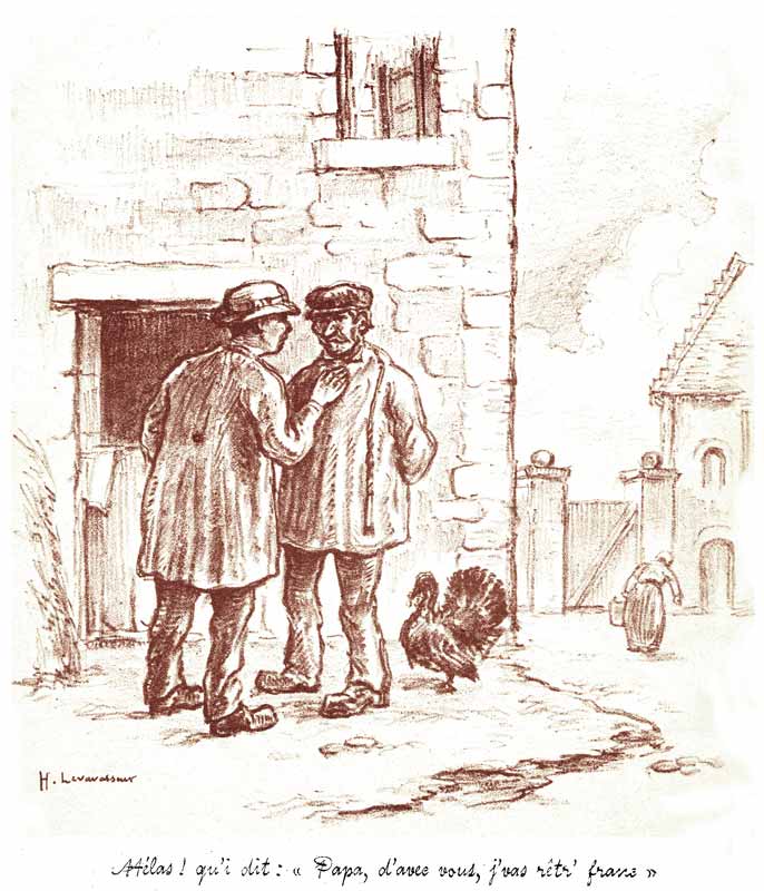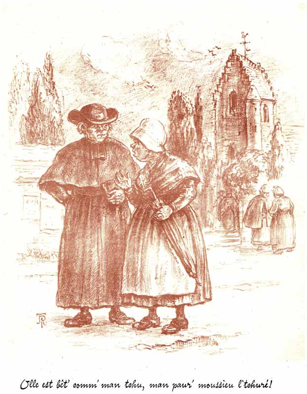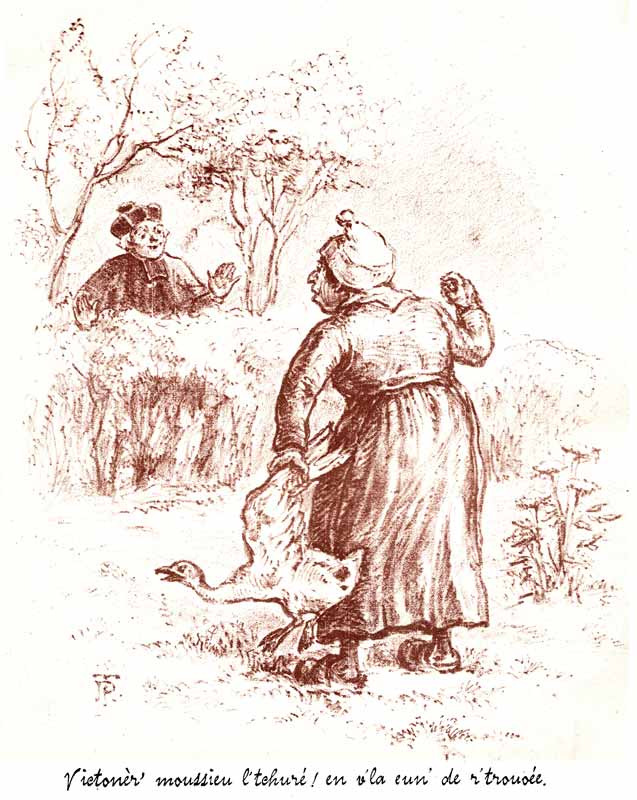 rappell' que, dans man jeune âge, Lé t'churés n'taient pas malheureux, Et lé bouenn's âm's de nos villages Avaient bi dé bontés por eux ; Lé sienn's qu'étaient bi forteunées, Leux baillaient d' bouenn's chos's à gogo, Mais cell's qu'étaient intéressées Donnaient plutôt c' qu'o z'avaient d' trop. Y s'trouv' des années fruitageres, Où que n'y'a des quantités d' peires ; Ces années-là, c'est bi'n aisi A san t'churé d'aller n' n'offri : C'est por cha qu'un matin, la maîtresse Adélie En donnit à sa fille eun' bourrich' bi remplie. « - Tu vas, qu'o l'y dit, la porter « A not' t'churé, au presbytère, « Et surtout prends t'y bi d' manière, « Por qu'y n' manqu' pas d' les accepter. « - C'est bon, qu' répondit la petiote, « J' sus pas gênée sû c't' affair' là ; « Tout l' mond' sait bi qu' je n' sus pas sotte « Et que j' caus' comme un avocat. » La bourrich' sous san bras, v'l'âllé la p'tit' Fanchette. « - Boujou, Moussieu l' t'churé, qu'o dit en arrivant, « V'là d' la part de ma mère eun' bourrich' de peir's blettes « Va pourré lé mangi sans vo casser lé dents ». « - Dis à ta mère que j' la r'mercie, « Qu' l'y répondit l' t'churé, je lui en sais bon gré, « Mais je n'accepte pas, craignant d' vous en priver, « Remporte-les, ma p'tite amie. » « - Cha n' no priv' brin du tout, j'en avons tant c't' année, « Répondit la pétiot', qu' cheux nous, no march' dessus, « J'en somm's tertous fûtés, no cochons n'en veul'nt plus; « Cair'yé bi qu' c'est de bon cœur que j' va l'z'ai apportées. » « - Eh bien ! qu' dit l' bon t'churé, j'accepte ton présent, « Un de ces jours, j'espère « Aller r'mercier ta mère, « Et sur ta politess', lui fair' mon compliment. » Aussi, l' dinmanch' sieuvant, à la sortie d' l'église, Avisant la maman, l' t'churé fut la trouver, Et d'abord, por lé peir's, c'mmenchit par la r'mercier, « - Maint'nant, j' vais vous parler, qu'y dit, avec franchise. Et là d'ssus y l'y racontit C' que la pétiote l'y'avait dit. « - Elle a, qu' dit l' bon t'churé, montré trop d'inconv'nance « C'est vrai qu' c'est encore une enfant, « Elle est bien jeun', mais cependant « Vous devriez lui faire un' petit' remontrance « Afin qu'à l'avenir, dans ses conversations, « Ell' sache, avec décenc', choisir ses expressions. » « - Pardié, que l'y répondit la mère, « Cha n' m'étonn' brin d' ma ménagère, « Je m' demand' qui que j' f'rai de c'te p'tit' coch' lanré. « Olle est bêt' comm' man t'chu, man paur' moussieu l' t'churé !! » |