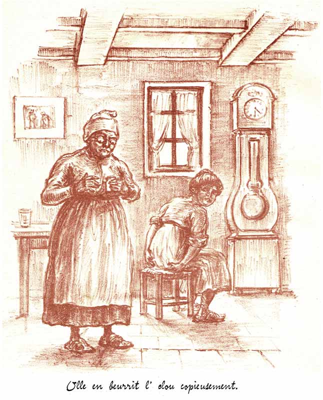 amen, dico vobis, Clouso fessiès for doloris. A c't' heu, quand j' vo cont'rai d's histouères; J' lé commench'rai tout's en latin, J’ lé finirai d' la mêm' manière, Mais l' mitan s'ra du pur Bocain. Y'avait jadis, à Ond'fontaine, Un t'churé qu’était raid' savant, Et qui connaissait la méd'ceine Bi mue qu' tous lé méd'cins d' san temps; C'était surtout lé forbétures, Lé panaris ou lé touerniants, Qu'y guérissait s'lon leux nature Avec plusieurs espèc's d'onguents. Faut dir' que çu bouen homm' de science, Allait souégni lé gens partout, Simp'elment par acquit d' conscience Et sans qu' cha l'y rapporte un sou. Y'avait dans un village, en d'valant su la Beigne, Eun' femm' que nos app'lait, d' san nom, Fanchon Pitrou, Qu'était bi sottisièr', comme c'est qu' no dit t'chu nous. Et tout l' monde avait poue d' sa mauvais' goul' d'empeigne. Olle avait, por sa punition, Récolté par procuration, Y'avait d' cha eun' quinzain' d'années, Eun' fill' ma fé raid' bi touernée ; No l'app'lait, dans l' pays, Locadie à Fanchon, Por n' pas qu' no s'trompît avec d'autr's du mêm' nom; Or, v'là qu' not' Locadie S' trouvit bi'n affligie, Y l'y'était v'nu un clou qu'était si mal plachi, Qu'la malheureuse éfant n' pouvait pas s'assiessi ; Véyant cha, la Fanchon s'en fut au presbytère, Por que l' t'churé savant L'i guérisse s'n éfant: Et dès en arrivant, o l'i contit l'affaire, Comment qu'cha l'avait prinse et où qu' c'est qu'était l'clou, D'qui qu' sa fill' souffrait tant, bref, o l'i contit tout; Quand y l'eut entendue, l' t'churé dit : « - Ma bonn' mère, « D'ordinair' ces clous-là, ça fait beaucoup souffrir, « Mais, avec un 'p'tit peu de mon onguent, j'espère « Qu'avant quarant' huit heur's, nous le f'rons aboutir. » La bouenn' femm' partit rassurée, En emportant l' précieux onguent. Et dame, aussitôt rarrivée, Olle en beurrit l' clou copieusement. Paraît qu' dans c't' onguent-là, y'avait dé drogu's maleignes, Car, quand la p'tiot', por san malheur, Fut dans san lit à la chaleur, Cha c'mmenchit, comm' no dit à l'y haler la couenne, Et tout pendant la nut O n' put pas fer-mer l'u. Et lend'main au matin, quand sa mèr' fut la vaie, O l'i dit en pleurant, Tout comme un p'tit éfant : « - Hélas' ma paur' maman, j' souffre comme eun' damnée, « Moussieu l' t'churé s'est p'têt' trompé « Su l'onguent qu' tu m'as rapporté, « Cha dait rêt' por un ch'va, l' sien qu' t'as mins su ma fesse; « Pus qu' c'est agneu dinmanch', va l' va e apreux la messe, « Qu'il arrive à t' bailli « D'qué par em' soulagi. » Quand Fanchon arrivit, l'église était tout' pleine, Et, monté dans la chair', l' bon t'churé d'Ond'fontaine, Por fair' poue à sé parouaissiens, Disait comm' cha d'un ton funèbre : « Vous irez tous, mauvais chrétiens, « Chez Belzébuth, princ' des ténèbres ! » Il allait continuer l' sermon, Oui mais, quiqu'un troublÎt la fête, C'était la sottisièr' Fanchon, Qui l'i criait tout l'hât d' la tête: « Eh ! qui qu' je m' fous d' vot' Belzébuth ! « All'ous-en bi plutôt vaie ma paur' Locadie, « D'avec vot’ gueux d'onguent, comme olle est arrangie, « C'est eun' pitié que d' l'i vaie l' t'chu ! » A c't'heu, por teni ma promesse, Faut que j' vo raconte, en latin, Comment qu'opérit su la fesse, L'onguent du bon t'churé méd'cin. Tantum ergo, clouaboutit. Soulagibi Locadii. |