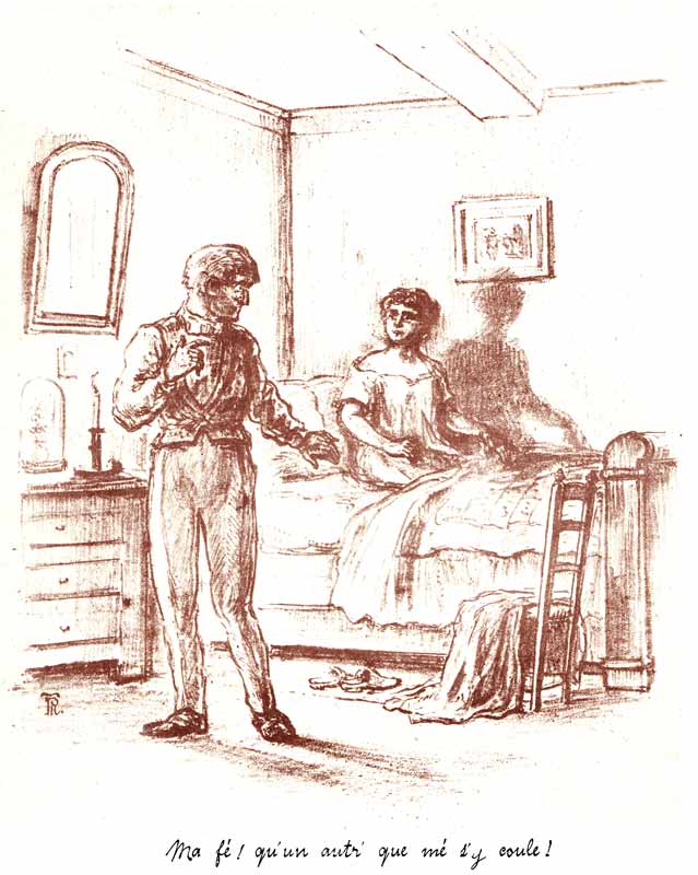 Pacifique Touchard, Epousit sa femme Arthémise, Y n'tait jamais en r'tard Sû la chose d' la paillardise. La gentill' dame était, là-d'ssus, Comm' c'est qu' no dit, un brin gouermande, Mais sans qu'o l'yen fass' la commande, Y l'i baillait c' qui l'y était dû. Arthémise était bi d' sept, huit ans, la plus jeune, Aussin quand Pacifiqu' commenchit à s' vieuilli, Fallut bi qu'o s' restreigne un brin su san plaisi ; Y'en a qui riraient d'cha, mé j' plains bi s'n inforteune. D' couchi si souvent dos à dos, Cha l'y avait changi l' caractère Et sans por' cha s' mettre en colère, O l' chicanait à tout propos. O s' comparait à ses amies, Qu' l'homme à eun' telle était biau gas, Que l' sien d'eune autre n' calait pas. Et qu'ell', c'était la mal servie. Çu paur' brave homm' de Pacifique Ecoutait cha bi tranquill'ment ; Y n' manquait portant pas d' réplique, Mais s' taisait core l' plus souvent. Y's avaient eu, d' leux catt' Tempête, Un jeun' cat qu'i's avaient él'vé ; L' bouenhomme ainmait bi la p'tit' bête Et bi souvent s'en amusait. Un jou qu'assis preux d' la ch'minée, Y sommeillait d'vant lé tisons, V'là t'y pas qu' sa culotte à pont S' trouvit censé déboutonnée ; L' petit cat, qu'arrivait, Vit quiqu' chos' qui pendait Et s' dressait déjà su sé pattes; Mais Arthémis', la scélérate, S'mint à cairier derrièr : « - Veux-tu bi laissi cha ! » « - Allon! qu' l'i dit l' boùenhomm', laiss' dont c' cat-là tranquille. » « - Pardié ! J'sais bi ! qu'o dit, qu' c'est l' mieux vu d' la famille ; « Quand y'a un bon morcé, c'est terjous por el' cat ! » |