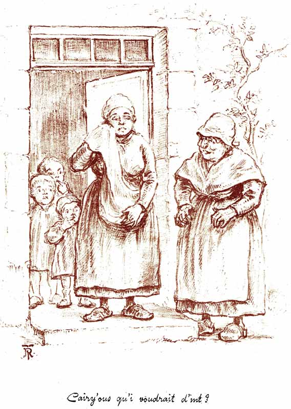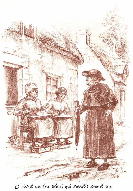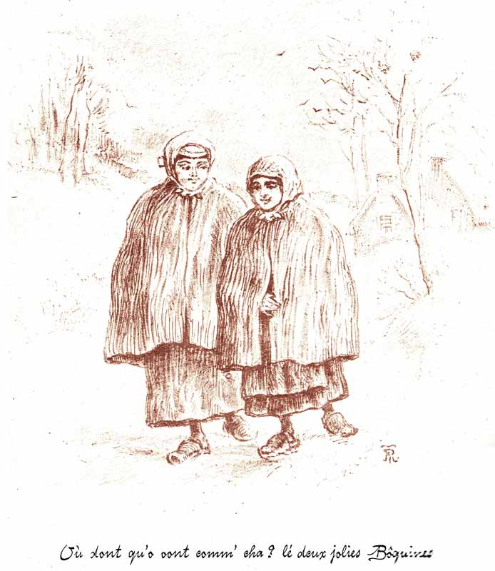 », Etait bouenn' femme assurément, Mais dame! o causait si drôl'ment, Qu' tous lé gens du pays s'amusaient d' sa tapette; Olle estropiait Tout c' quo disait; N'importe éiou qu'oll' tait, y fallait qu'o débite Terjous d'avec dé drôl's de mots, Qu'olle empélyait mal à perpos, Mais por bi s'expliqui, o causait bi trop vite. Ulalie, sa jeun' fille, eun' raid' gentille éfant, Qui pouvait bi'n avé comm' dans lé dix-huit ans, Avait bi'n à souffri d' sa mère, Et o faisait Tout c' qu'o pouvait, Por arriver à la fair' taire. Or, v'là t'y pas qu'un jou, qu'os étaient tout's lé deux, Assis's devant leux porte, à faire d' la dentelle, Por mettre ès attifias dé dam's et dé d'mouéselles, O vir'nt un bon t'churé qui s'arrêtit d'vant eux Et leux dit d' bi voulai l'y' indiqui l' presbytère. « - Ma fé oui, qu' dit la vieull', c'est bi'n aisi à faire, « Vo véyé bi l' chemin que v'là tout drait d'vant vous, « Vos allé l'enfiler quasiment jusqu'au bout, « Apreux cha, vos allé dévaler la cavée « Et découvri l'églis' qu'est en hât d' la montée; « Vos allé la longi jusque t'chu l' maricha « Qui d'meure en bas d' la côte; eun' fais arrivé là, « Y n' va plus vo rester qu'un p'tit crochet à faire, « Et vos allé tumber tout drait sû l' presbytère. « Comm' cha, j' cré bi, moussieu l' t'churé, « Qu'vo n'allé pas manqui d' trouver. » « - Faut croir', dit l'bon pasteur, que je n' suis guère habile, « Après ces ch'mins à parcourir, « Et puis l'église à découvrir, « Tomber su l' presbytèr', je n'vois pas ça facile. « - Attendé, qu' dit Marianne, y a core un autr' moyen, « Véyons té, Ulalie, tu connais bi l' chemin; « Au lieu que d' rester là, assis' comme eun' poupée, « Pus qu' c'est qu' çu paur' moussieu « N' peut pas trouver tout seu, « Allons véyon', lèv' dont tan t'chu et fais-li vée ! » |