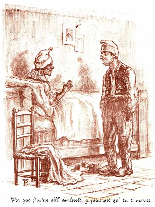 not' bon pays du Bocage, No n'haït pas lé cont's plaisants Et j'en ai ouï, dans man jeune âge, D'aucuns qu'étaient bi'n amusants. Je m' rappell' que not' couturière, Quand o v'nait coudre à la maison, En savait dé drôl's à fouaison, Qu'o racontait mue qu' sa périère... Olle est où qu' c'est qu' j'irons tert-ous, C'te paur' vieull' Désirée Monique, Qui no faisait rir' comm' dé fous, D'avec sé cont's si drôlatiques. J' cri bi qu' c'est la chos' d'en causer, V'là qu'y me r'pass' dans la cervelle Eun' de sé plus joyeus's nouvelles, Qu’olle ainmait tant à raconter; Olle est p't'êt' bi un brin légère, Mais l’ diable sé dé mal plaisants, Qui n' rient jamais qu' du bout dé dents ! La vlà, por lé mettre en colère. J' vas vo la dir' comme j' la sais; D'apreux la bouenn' Moniqu' de qui que j' la répète, Paraît qu'o s'est passée au pays d' la Happette, Où qu' c'est lé pies qui côqu'nt les guais. (1) Y'avait, dans c' pays-là, eun' bouenn' femm' restée veuve D'avec un grand garçon, et y faisaient valai, Ensemble, en s'entr'aindant, eun' ferm' que nos app'lait, J' n'ai jamais su por qui, la ferm’ de Porte-Neuve. L'gas n'était pas chargi d'esprit, Mais il avait bouen appétit; Il 'tait connu par sa bêtise Et co pus por sa gouermandise. Surtout, c' qui l'i semblait l'meilleu Parmi lé choses d'la mangeaille, C'était eun' belle et bouenn' volaille, Rôtie au bouais, d'vant un bon feu. Sa mèr' qu'était déjà âgie, Airait bi voulu qu'i s'marie, Car la bouenn' femme n' tenait pas A l'ssi çu paur' malheureux gâs Marchi tout seu dans l'existence D'avec sa triste intelligence; Faut dir' qu'il 'tait bi'n ignorant Du mariage et d' ses agréments; Y n' manquait pas d' fill's dans l'village, Dé gentill's blond's, dé breun's itou, Mais cha n' li disait rin du tout, Y n' voulait pas s' mettre en ménage Et s'rait resté longtemps comm' cha, Sans qu' sa bouenn' mèr', qu'était pas bête, Trouvit un moyen dans sa tête Por 1'i fair' lâchi l' célibat. Pendant qu'il 'tait à la quérue, O fit rôtir un biau poulet, Qu'était si joliment doré Qu'y vos en réjouissait la vue; Apreux cha, o s'en fut s' couchi. Et quând sa bêt' de gâs rentrit, O mint par sous la couverture, Enter sé gambes, l'biau poulet; Man cont' paraît p't'êt' indiscret, Mais c'est la vérité tout' pure' Et pus, au surplus d' tout, Y n' faut pas tant d' mystère, Si cha vo met colère, N'allé pas jusqu'au bout ! A c't' heu, mé bons amis, por vo fini m'n' histouère, Quand c'est qu' not' gas rentrit, Qu'y vit sa mère au lit, « - Hélas ! qu'i dit comm' cha, ét' ous malad', ma mère ? » « - Dame oui! qu'o dit; cha n'va pas bien « Et d'avec cha, j'ai du chagrin; « Pourrait s' fair’ que bitôt j' vienne à quitter la vie « 'Et de c' qui m'fait l' plus d' deu, «C'est de t' laissi tout seu ; « Por que j' m'en aill' contente, y faudrait qu' tu t' maries. » « - No dit que d' prendre eun' femm', c'est s' mettr' la corde au cou, « Por mé, qu' répondit l' gâs, j' m'en méfie comm' du loup. » La bouenn' femm', tout douc'ment, soul'vit la couverture Et c' qu'aperçut l' gouermand li changit la figure; « - Qui qu' c'est dont qu'cha, maman ? qu'y dit, tout ébahi, « No dirait quasiment qu' c'est un poulet rôti ? » « - Bi sûr que c'en est un, qu'li dit la vieull' rusée, « Un biau poulet rôti et tout' femm' qu'est mariée « En met un tous lé soirs comm' cha, « Por san mari, dans c't' endrait-là. » « - Les homm's mariés font donc tous lé jours la ripaille, « Qu' répondit not' goulu, mordant dans la volaille, « Cha leux est bi'n aisi, « De s' régaler d' rôti; « Ma fé, qui qu' no n' f'rait pas por du bon comestible, « Mariez-mé dont, maman, l' plus tôt qu'i s'ra possible; « Chouaisissé la bru qu' vo voudré, « La-d'ssus man goût s'ra l' mêm' que l' vôtre, « Por mé, je m' fous d' l'eun' comm' de l'autre, « Porvu qu'olle ait un biau poulet.» Y' avait dans l'autr' bout du village Eun' bouenn' gross' fill' de dix-huit ans, La bouenn' femme n' perdit pas d' temps, Et fut la d'mander en mariage. La neuche eut lieu un mouais àpreux, L' marié paraissait tout joyeux; Y n'avait d'yeux qu' por la mariée; Dam' c'est qu'o r'présentait por li, En plus d'eun' femme, un bon rôti, Et tous lé jours à coeur d'année, Y s' régal 'rait Tant qu'y voudrait. Y paraissait tout feu, tout flamme: Aussi, quand lé d'mouésell's d'honneur, Li permettir’nt, por san bonheur, D'aller au lit r'trouver sa femme, Y mint la main vite à l'endret, Eiou qu'i d'vait trouver l' poulet, Qu'était censé sorti d' la broche; Mais y restit Tout ébaubi. « - Hélas! qu'i dit d'un ton de r'proche, « El' sien à ma paur' mère était mieux acc'modé, « Car il 'tait bi rôti; l' tien n'est co pas pleumé ! » __________ (1) Guai, c'est le nom du geai, en patois. |