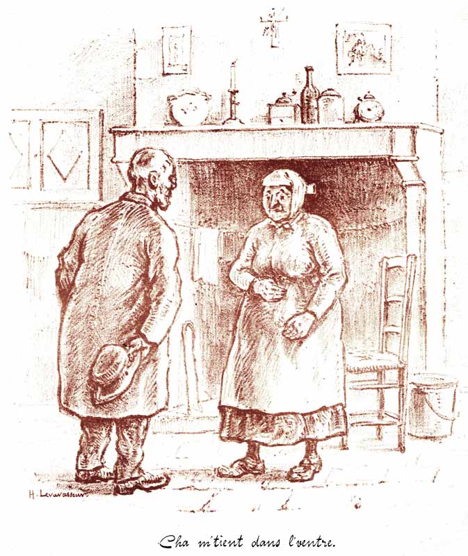 trouv' quiqu'fouais dé maladies Qui s' jett'nt comm' cha su l' corps humain, Qu'eun' paur' femme est bi'n affligie, Quand faut qu'olle aill' trouver l' médecin ; C'est qu' cé gas-là sû la nature Es femm's pos'nt quiqu'fouais dé questions Qu' cha gên' bi lé paur's cairiatures' Su la pudeur… quand o's en ont. Portant, lé mâtein's de bôquines N'ainm'nt pas rester la goul' sous l' nez, Et por répondr' su la méd'cine, Trouv'nt dé bons mots dans leux patouais. Y'avait la femme à Jean Dardenne, Un coup qu'o s'en fut l' consulter, Qu'en répondit comm' châ eun' bouenne Au paur' défunt méd'cin d'Aunay. Olle avait d's espèc's de coliques. ¬ Et fut dont l' veie à caus' de cha, Mais comme y voulait qu'o l' y' explique L’endrait bi juste iou qu'était l' ma' : « - Dam', qu'o l'i dit, j' sieus bi gênée « Por vo dir' cha, man bon moussieu, « C'est à la pointe d' la couérée ; « J'en souffre tant l' jouer et la nieut, « Que n'y' a dé coups qu' j'en sieus tout' pâle « Et c'est comm' si no m' rabûquait « Dans l' ventre avec eun' fouerque à mâle ; « C'est-i' cha qu' vo vouliez saver ? » « - Mais non ! mais non ! ma bonne amie, Qu' dit l' méd'cin qui s'impatientait, « Faut m' dire où est votr' maladie, « Afin que j' puiss' vous soulager. » « - C'est là, qu'o dit, au coin du ventre; « J' vos expliqu' portant cha d' man mieux ; « Juste au mitan, comm' cha là, entre « El nombrin et l' Divertisseux ! » |