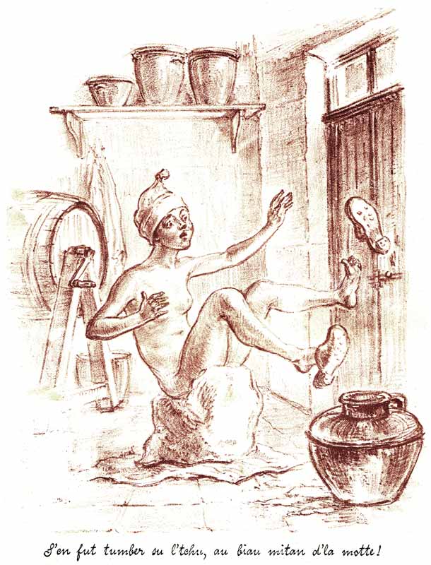 la gentill' femme au custos d' Vaucougrain, Por lé choses d' l'amour, qu'avait l' coeur su la main. Et, dès l' matin, trouvait les moyens d' satisfaire San brave homm' de custos, l' t'churé et san vicaire. Dès l' matin, à six heur's, partait çu bon custos, Por aller, au vicair', répondr' la permièr' messe, Pendant c' temps-là, l' t'churé, d'avec sa bouenn' bougresse; S' mettait bi vite en train d' fair' la bête à deux dos, Et apreux s'en allait à san tour à l'église, Dir' sa mess' que l' custos, aussi, l'i répondait, Pendant que l' bon vicaire, à san tour, s'en allait, Do sa femm', satisfair' sa vilain' paillardise. Cha durait d'puis longtemps comm' cha, Sans qu'aucun d' ces deux pasteurs-là, Sach' qu'i mettaient tous deux l' nez dans la même écuelle, Et çu paur' bon custos, Airait parié bi gros Et mis la main au feu qu' sa femm' l'y' était fidèle. Ces affair's-là marchaient trop bien, Car, v'là t'y pas qu'un biau matin, L' paur' t'churé s'endormit d'avec la ménagère Et qu'i fûr'nt réveillis par el' bruit d' la barrière, Qui fermait la p'tit' cour précédant la maison; Y' s'en manquir'nt tous deux d' tumber en pamouéson ; « - Hélas! qu'dit la donzell', d'eun' vouaix épouvantée, « C'est m'n homm', moussieu l' t'churé, montez vit' l'escalier, « Y'a là, au-d'ssus d'not' lit, eun' soupent' pas fermée, « Tâchez d' vos y muchi, pendant que j' vas l' renv'yer. Cha n'était pas l' custos, mais l' paillard de vicaire, Qu'arrivait l'oeil ardent, Et s' mint incontinent A caresser la belle, au lieu d' lir' san bréviaire; Mais pendant qu' sans souci, y pernaient leux ébats, La punition d' leux crime arrivait à grands pas. L' custos, n' véyant pas v'ni l' t'churé por dir' sa messe, A sa maison r'venait tout dreit, Et l' bruit d' la barrièr' qui s'ouvrait Interrompit du coupl' les coupables caresses. « - Bi vit', que dit la femme au vicair' déconfit, « Muchez-vous dans la v'nelle et surtout n' fait's pas d'bruit.» Ah! dame, il était temps, l' bon custos, sans méfiance, V'nait d' pénétrer dans la maison, Et, poussé par la tentation, Y s'approchait du lit, l'oeil plein d' concupiscence. « - Hélas! qu'dit sa femm', véyant bi « Eiou qu' c'est qu'i voulait en v'ni, « Tu sais bi, man paure homm' que j' somm's dans la misère, « Tu n'as donc pas d' raison, j' vé bi c' que tu veux faire, « Et si malheureus'ment y no v'nait un éfant, « Crairais-tu qu' cha suffise, « Ta p'tit' plache à l'église, « Por nouerri c't' éfant-là jusqu'à c' qu'i devienn' grand. » « - Mais, qu' dit l'custos, pensant à la bonté divine, « J'ai confianc' que l'sien qu'est là-hât « N' no laiss'rait pas dans l'embarras « Et qu'i nos enverrait du lait et d' la farine. » L' malheureux t'churé, qu'entendait, Crut qu' c'était d' li qu'i s'agissait, Mais comme y savait bi (sans qu'i l'y eût vu la face) Que c' n'était pas l' custos qui l'y avait prins sa place : « - J'accorde tout, qu'i dit, en d'scendant l'escalier, « Mais je n' veux pas qu'un autre en rie, « Et s'il faut payer la bouillie, « Celui qu'est dans la v'nelle en paiera la moitié ! » |
