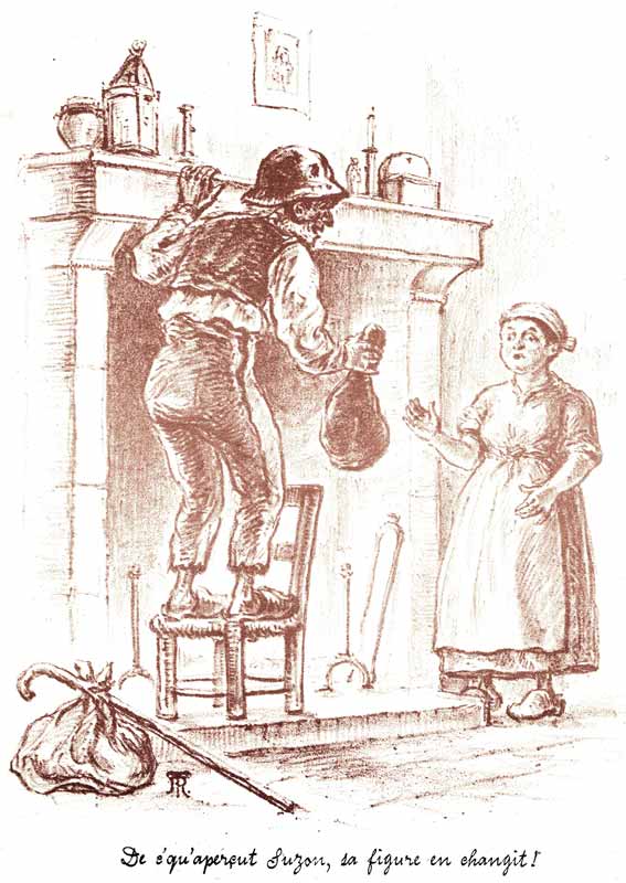 rappell' que dans man jeun' temps, Quand no causait du « haut-du-temps », C'était l'entrée d' l'hiver, quand il est preux d' la porte; No faisait po c' temps-là dé provisions d' tout's sortes; Faut qu' no sé prévoyant Por lé bêt's et lé gens; Si no veut qu' tout cha sé bi'n' assuré d' sa vie, Faut mettr' du lard dans l' pot, du foin à l'écurie Et à bair' dans l' tonné, Qu'y n' faut pas ombélier. Mais v'là que l' haut-du-temps m' fait rapp'ler d'un vieux conte Qui s'rait quasi du bouais, D' qui qu' no fait lé grivouais ; J' vas vo l' conter tout d' mêm', j' prends l' péché su man compte. Y'avait dans l' Pays d' bas, un brave homm' de t'churé, Qu'avait prins por servante Eun' bouenn' fill' bi prév'nante, Et por fair' la cuisine, olle en airait r'montré A la meilleur' dé cuisinières Mais por cha, n'n'était pas plus fière; Seul'ment c'te paur’ Suzon, Por l'app'ler par san nom, Avait eun' bi vilaine ohie: Olle était bête à faire envie ; La malheureus' cairyait Tout c' que no li disait. Et olle était bi'n innocente Sû c' qui rend l's autr's fills' bi contentes; O s' passait bi de c't' affair' -là Et o n' s'en' portait pas plûs ma. L' bon t'churé li disait: « Tu fais bien la cuisine, « Mais, ma pauvre Suzon, t'as d' quoi fair' pour êtr' fine; « Tu n'as pas ta pareill' pour faire un bon rôti, « Mais j' suis forcé d' te l' dire, tu n'as aucun esprit. » En exerçant leux ministère, Lé t'churés ont d' bouenn's occasions; L' maître à Suzon, au presbytère, Un jou, r'vint d'avec deux jambons. « Tu vas, qu'i lui dit, nous fair' cuire « Un de ces jambons pour demain ; « Il me sembl' déjà qu' j'en respire « La bonn' cuisson dans du p'tit foin; « Le second prendrait bien encore un peu d' fumée, « Nous faisons du feu d' bois, mets-le à la ch'minée, « Surtout fais attention à c' qu'il soit bien pendu; « C'est pour le haut-du-temps, quand il sera venu. « Il faut encor', pendant qu' j'y pense, « Que j' te raisonn' sur notr' dépense; « Ce que nous donnons aux mendiants « Me paraît bien considérable, « Et je soupçonn' ces misérables « D'un procédé peu édifiant : « Au lieu d' venir un' fois la s'maine, « Pour quémander un peu d'argent, « Sachant ta mémoire incertaine, « Ils doiv'nt venir bien plus souvent; « Si tu n'es pas assez matoise « Pour reconnaître ces fripons, « A l'av'nir tu prendras leurs noms, « Pour les inscrir' sur une ardoise ; « Tu n'auras qu'à la consulter, « Pour, en cas d' fraud' les évincer ». L' t'churé disait tout cha, la porte enterbâillie, Sans veie qu'un tracheux d' pain, Qu'était muchi au coin, En l'écoutant causer, n'n'avait la goul' réjouie. C’ mauvais gas-là, voulant en tirer du profit, Attendit, un biau jou, que l' t'churé fût parti Et vint sonner au presbytère, Où qu'était seul' not' ménagère; Tout d' suit', la brav' Suzon vint veie qu'est-c' qui sonnait, Et, véyant l' vieux mendiant, li d'mandit c'qu'i voulait. « - Hélas! qu'y dît, ma bouenn' servante, « Por mé séyé compatissante, « Si vo saviez combi qu' j'ai faim, « Fait's mé l'aumôn' d'un morcé d' pain. » « - J' veux bi, qu'o dit; oui mais, comment qu' no vos appelle, « Faut m' dir' vot' nom avant. » « - C'est bi'n aisi, qu'i dit: por vo servir, mam'zelle, « J' m'appelle l' Haut-du-Temps.» . « - Tiens! qu' dit Suzon, tout étonnée, « Moussieu l' t'churé m'a dit vot' nom; « Cha s'rait t'i pé por vous l' jambon « Qu'i m'a fait mettr' dans la ch'minée ? » « - Je l' savais bien, « Qu' dit l' vieux coquin, « Mais vot' t'churé absent, je n' voulais pas vo l' dire. » « - Cha n' fait rin,qu' dit Suzon, en marchant d' vant l' biau sire. « Si vo l' voulez, m'n ami, « La chose est bi'n aisée; « V'nous en pa là l' trachi, « Il est dans la ch'minée. « Vos allé bi l'aveindr', por mé, il est trop hât. « Montez sû c'te t'chaire ' là, mais méfi'ous d' vo fich' bas. » « - N'y a pas d' dangi, qu'i dit, quant à mé, ma brav' fille, « Je n' crains pas l's accidents. » Oui, mais v'là qu'en montant, Y fendit, au fouerquet, sa vieull' culotte en gu'nilles. De c' qu'aperçut Suzon, sa figur' en changit : « - Ah! qu'o dit, man paure homm', vot' couérée est d'scendue.» « -Mais non, qu'i dit, mam'zelle, olle est plus hât pendue, « Et c' que vo véyé là, cha s'appelle d' l'esprit. » « - Hélas! qu' dit l'innocente, « Faut qu' vo m' rendiez contente; « Man maître m' dit terjous qu' j'en ai pas por deux sous, « Von' allé bi sûr pas m'en r'fuser un p'tit bout ? » « - Attendez, qu' dit l' vieux gas, qu'était en train d' descendre, « J' peux pas vos en donner, mais j' peux bi vos en vendre. » « - Pouvez-vos, qu'o l'y dit, m'en bailli por trouais francs ? « - A caus' que c'est por vous, j'veux bi », qu'dit l' Haut-du-Temps. Malgré qu' Suzon trouvît l'opération bizarre, O s' laissit mettr' l'esprit¬, Et dans ell' réfléchit Qu'o ne r'trouv'rait jamais eune occasion si rare : « - Dit's dont, qu'o dit, j'ai co dix sous, « Pendant qu' vos y êt's, empél'yé tout. » Si j'étais un bouenhomme à conter d's indécences Dans sé moindres détails, j' pourrais vo raconter Comment qu' triomphit l' vic' de la tendre innocence, Mais j'ainm'rais mieux qu' no m' coup' la langu' que d'en causer, J'ai trop d' réserv' por cha; là-d'ssus qu'i vo suffise D'apprendr' que l' Haut-du-Temps s'acquittit d' sa mission, Et qu' chins minut's apreux, y partait do l' jambon ; Trouvez-en 'd'autr's que mé por vo dir' dé bêtises ; Et d' mé cont's amusants Voul'ous savé l'excuse ? C'est que l' sien qui s'y amuse Rit sans s' casser lé dents. C'est la' fin de m'n histouèr' qu'est la plus malaisie. Quand l' t'churé rarrivit, il était tout joyeux : « - Eh ! qu'i dit, la Suzon, viens par là, mon amie, « Il nous faut, pour demain, un déjeuner copieux ; « Tu sais que mes amis aim'nt la cuisin' soignée, « Or, j'ai quelques confrèr's à déjeuner demain, « Entre autr's un' fin' fourche