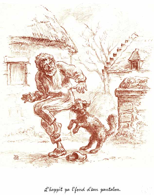 n'avé bi sûr pas connu La mèr' Fanchon Cliquet d' Biaussu ; Par t'chu nous, no l'app'lait tout bouenn'ment « la Cliquette », Et dame, o n'avait pas la langue à sa pouquette ; En l'i coupant l' filet, comm' c’est qu' no dit t'chu nous, La sag'-femm' ne l'y' avait pas volé sé chins sous. La Cliquette était veuv' depus bi des années Et o vivait. Comme o pouvait, D'avec quiqu's vergies d' terr' pas trop mal cultivées: Olle avait un vieux t'chien d' bergi, Qu'était raid' bon derrièr' lé vaches; Il 'tait bi connu dans l' pays Et répondait au nom d' Moustache. La bête avait du command'ment Et, sur un sign' de sa maîtresse, Vos airait bi sauté ès fesses, Comme en manièr' d'avertiss'ment. Paraît que n'y' a dé gas qu'ont d' qué dans la figure Qui déplaît bi'n és t'chiens, quand i's en vaij 'nt comm' cha ; Faut crair' que l' vieux Bernard, du hameau d' la Couture, Avait d' qué dans la goul' quasiment dans c' genr'-là ; Y faisait d' si vilain' s' grimaches Un jou d'vant l' t'chien, qu' çu brav' Moustache L' happit pa l' fond d' san pantalon, En l'y' entamant un brin l' croupion. Là d'ssus, Bernard, tout en colère, Por dé dommag's et intérêts, S'en fut bi vite au jug' de paix, Qui fit citer not' ménagère. Fallait veie la Fanchon A l'audienc', comme un diable, Traiter l'accusation De d' qué d'abominable. «- Au surplus d' tout, qu'o dit, c'est d' la faute à Bernard, « Si Moustach' l'a mordu un brin dans l' gras du lard; « Quand nos a eune goul' comm' la sienne, « No n' s'en va pas derrièr' lé t'chiens « Et apreux cha, chanter d's antiennes, « En s' tenant lé fess's à deux mains. « Pus qu'i m'a fait v'ni là, moussieu, vos allé veie ; « J' vas vo conter comment qu' la chose est arrivée, « Et qu' c'est bi li « Qu'a commenchi. « Supposons, moussieu l' jug', qu' vos êt's not' t'chien Moustache « Et qu' vos avé resté tout' la nieut à l'attache ; « No vo lâche l' matin à vot' grand content'ment, « Vo v'là parti, la queue en l'air et l' nez au vent ; « Vo vo n'n'allé trouver la t'chienne à Barbulée « Et la sienne à Debieu, « Qui sont tout's deux en feu. « Brav'ment vos en passez à chacu'eun' eun' touernée, « Et vo r'vené mangi vot' bouenn' soupe au caudé, « Que j' vos ai fait boueilli d'avec du lait truté ; « Vos en mangé eun' pleine écuelle, « Apreux, sû la mâlière, eun' fais qu' vos êt's bi r'pu, « Vo vo couché en rouelle. « La queue enter lé patt' et l’ nez aupreu du t'chu. « Vo dormé tranquill'ment, comme un t'chien bi'n honnête, « Quand çu grand bab’ las-là, metteux d' poul' à couver, « Qui passe amont l' chemin, s'en vient vo faire arjuer « Et vo fait dé grimach's avec sa goul' de bête, « Là-d'ssus, naturell'ment, vo l'y sauté au t'chu, « C'est-y d' ma faute à mé, si vo l'avé mordu ? » « - Messieurs, qu' dit l' jug' de paix, la cause est entendue, « La Cliquette a, ma foi, la langu' fort bien pendue; « Après son plaidoyer si rempli d'à-propos, « Sur Moustache et Bernard, j' renvoie tout dos à dos. » |