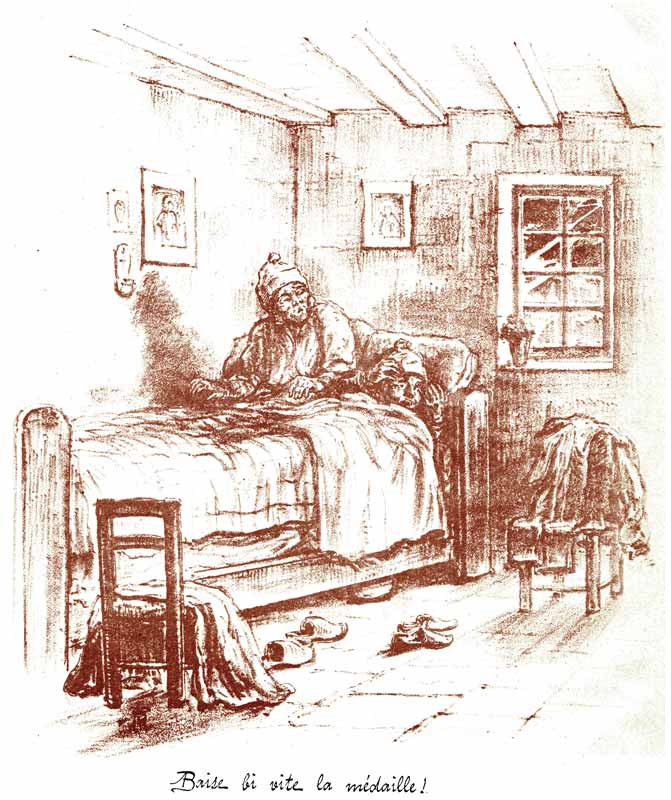 Anthim' Cornet, du hameau d' la Bût'rie, Etait v'nu quasiment jusqu'à sé chinquante ans, Sans s'aperchi d' l'églis, ni d' sé saints sacrements. Et jamàis y n'allait à pièch's cérémonies. Cha n'tait pas comm' sa femm', c'te paur' bouenn' vieull' Fanchon, Qu'était, comm' c'est qu' no dit, confite en dévotion. Por qui qu' no r'vient terjous à la r'ligion divine ? Prosper Anthim' Cornet, Un jou, attrapit fraid Et r'vint cheux li d'avec eun' défluxion d' poitrine. Quand Fanchon vit que s'n homm' était en dangi d' mort, Vite o print s'n' afflubas, qu'o mint par sû sa cotte, Et fut trouver l' t'churé por qu'i l'i graiss' sé bottes; La blàm' qui qui voudra, mé je n' l'i donn' pas tort. Quand l' saint homme arrivit, y prêchit not' malade. Et l'y fit tell'ment poue d' l'enfer, Que çu paur' malheureux Prosper S' véyait déjà dans l' feu, réduit en carbonade; Aussi l' t'churé, véyant sa bouenn' disposition, L'y administrit bi vit' la sainte Extrême-Onction. Mais lé Bocains ont la vie dure, Prosper Cornet n'en mouérut pas. Et comme il 'tait d'eun' bouenn' nature, La santé l'y r'vint à grands pas. Seul'ment depus c' temps-là, il allait à la messe, Et à tout's lé grand's fêt's no l' véyait à confesse. Y s'était converti Par la poue d'êtr' rôti. Por bi périer l' bon Dieu, faut saveir sa périère Du matin et du soir, et l' paur' Prosper Cornet Avait d' qué faire avant d' lé saver tout entières. Véyant cha, la Fanchon l'y' ach'tit un biau chap'let. Et sa confiance était si grande A c't' objet-là, qu' bi dévot'ment Olle y fit mettre, en bel argent, Eun' médaill' de La Délivrande. Quand l' bouenhomme en avait Récité quiqu's dizaines, La Fanchon l'y chantait Terjôus la même antienne : « - Surtout, por t'écapper d' l'enfer, « Bais' la médaill', man bon Prosper. » À quiqu' temps d'là, v'là qu'un orage Surprint no gens au lit, Au biau mitan d' la nuit. À chaque éclair, comm' c'est l'usage Tchu nous où qu' tout l' monde a la fouai, Y faisaient vite un sign' de crouaix ; L'orage augmentait sa furie, Nos aurait dit d'un incendie: « - Si no récitait, qu' dit Fanchon, « L' chap'let por not' préservation. » « - Mais tu sais bi qu'il est en bas, dans notre ormouère, « Et je n' vas pas m' risqui « A m'en aller l' trachi, « Qu' répondit l' paur' bouenhomm', j'ai trop poue du tonnerre; « Mais, qu'y dit, ma Fanchon, lé gens fins n' sont pas sots, « J'ai eune idée qu'en vaut eune autre, « Et j' pens' que lé gros noeuds qu' t'as l' long d' la raie du dos « Pourraient bi no servi d' pât'nôtres. » Bi vite l' dos en l'air, s' mint la dévot' Fanchon, Pendant que l' bon Prosper récitait l'oraison. L' deigt posé sû chaq' nœud, tout l' long d' l'épin' dorsale, Il arrivit bitôt preux d' l'ouvertur' rectale, Quand, tout d'un coup, v'là qu'un éclair Fit flamber la muraille. « - Ah! qu' dit Fanchon, man paur' Prosper, « Bais' bi vit' la médaille ! ». |